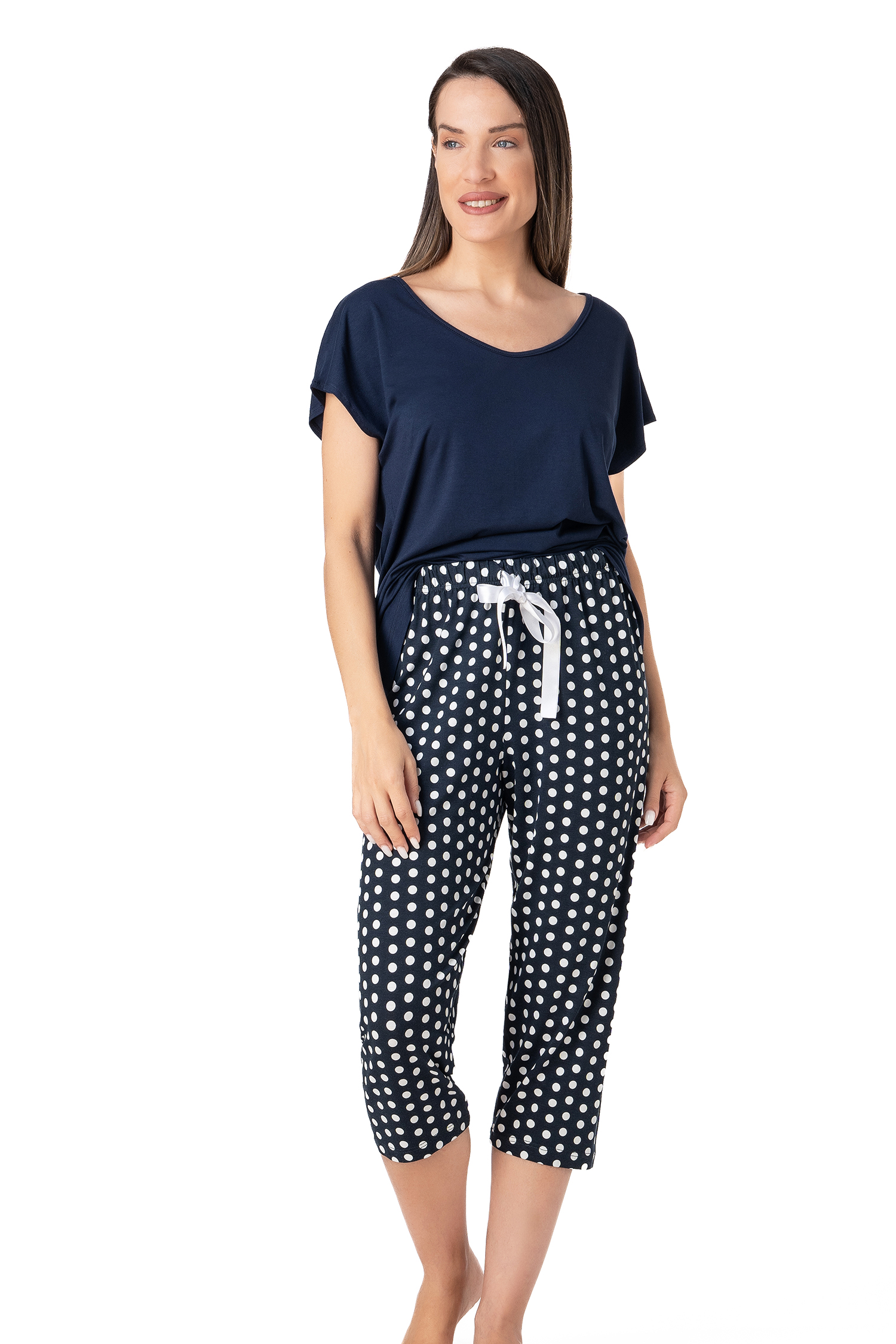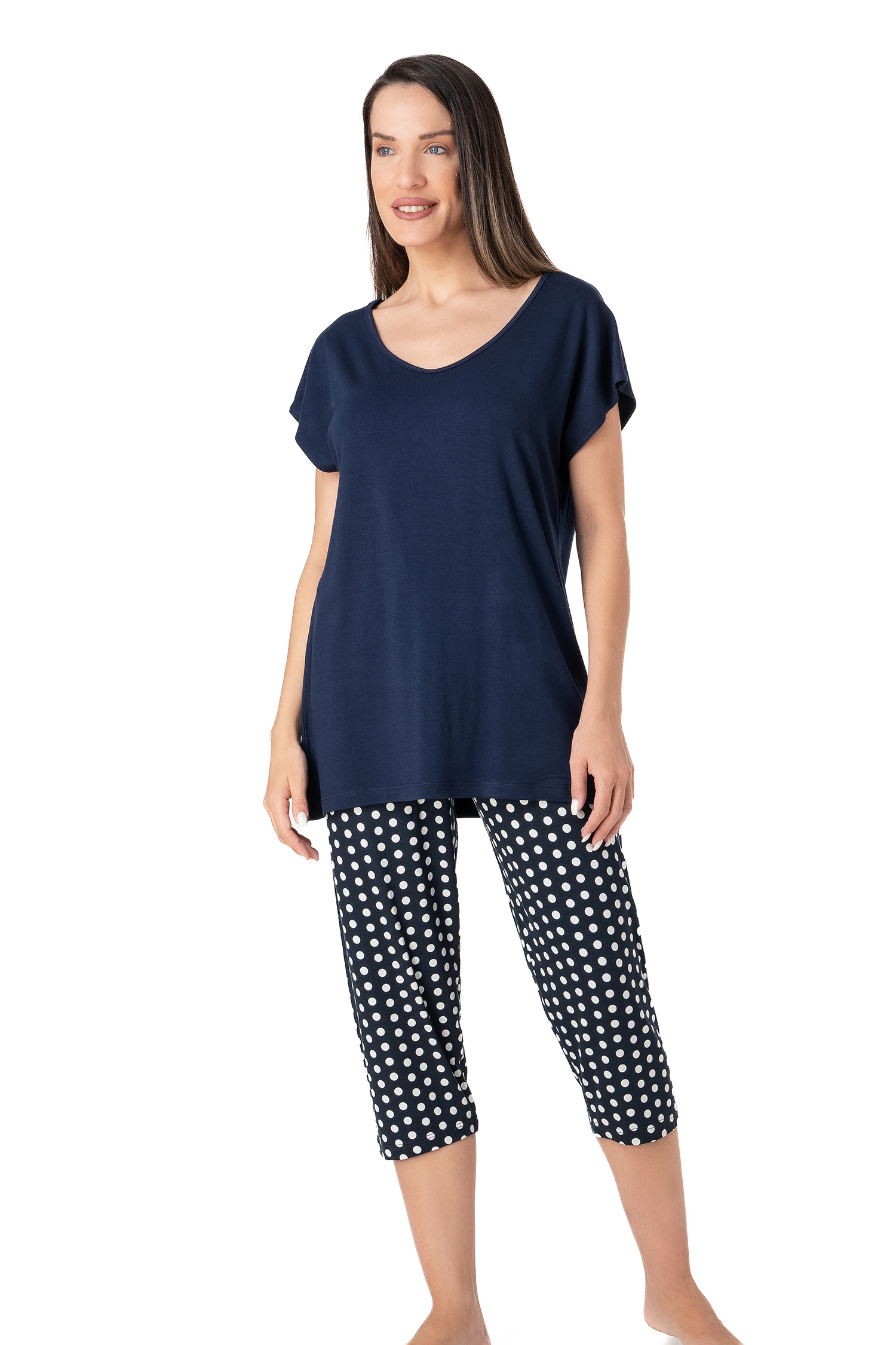 Γυναικεία βαμβακερή plus size πιτζάμα που καλυπτει μεγέθη απο 2XL έως 5XL Από απαλό μακό ύφασμα . Έχει κοντομάνικη μπλούζα με πατιλέτα από 3 κουμπάκια στον λαιμό και Παντελόνι κάπρι καρώ Μια ιδανική επιλογή καλοκαιρινής πιτζάμας!