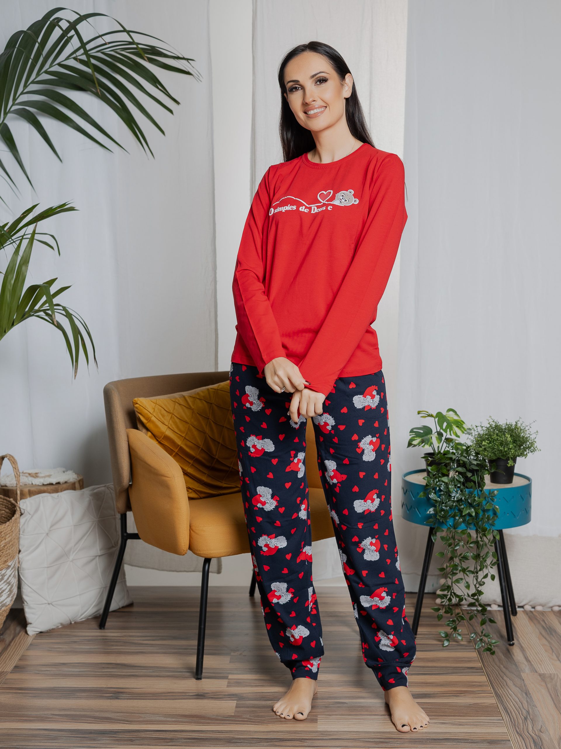 Βαμβακερή γυναικεία από πολύ απαλό ύφασμα βαμβακόλυκρας με ελαστικότητα. Μονόχρωμη μπλούζα με σχέδιο και εμπριμέ παντελόνι με καρδιές και αρκουδάκια Με μπάσκα στο τελείωμα