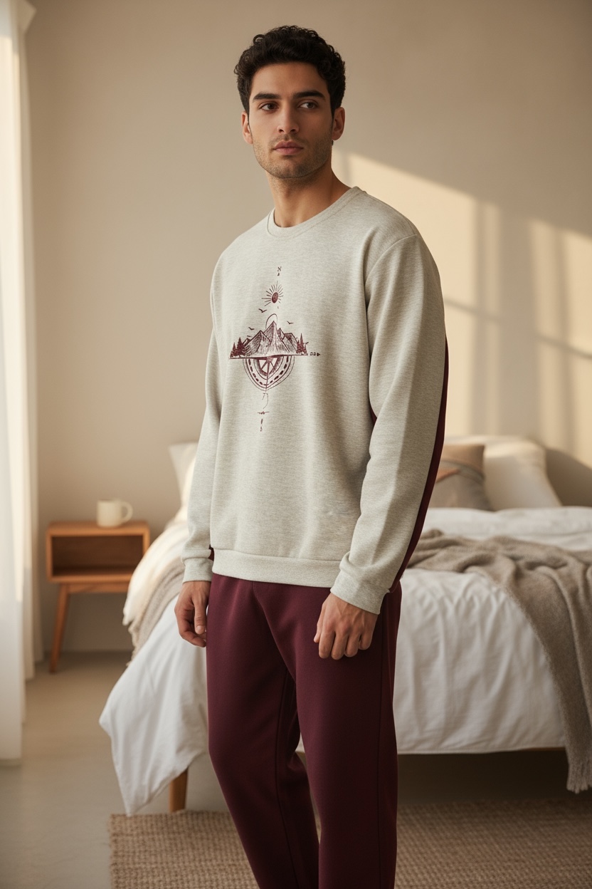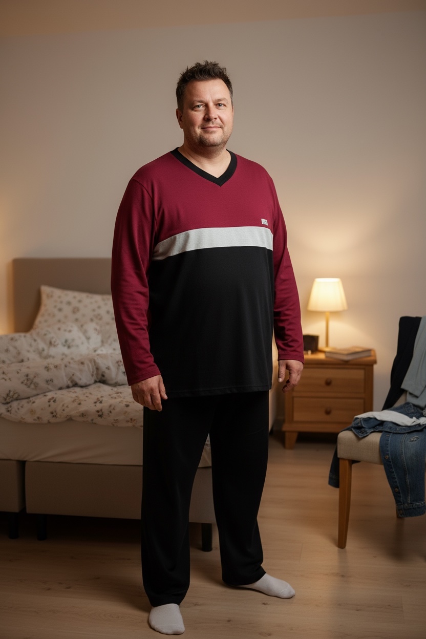 Ανδρική πιτζάμα σε υπερμεγέθη από απαλό βαμβακερό υφασμα Με V στον λαιμό και τριχρωμία στο μπροστά μέρος Σε ίσια άνετη γραμμή