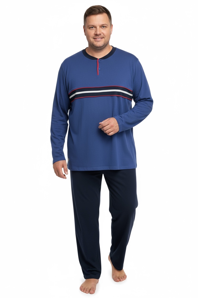 Ανδρική πιτζάμα σε υπερμεγέθη από απαλό βαμβακερό υφασμα Με πατιλέτα στον λαιμό και διακοσμητική ρίγα στο στήθος Σε ίσια άνετη γραμμή