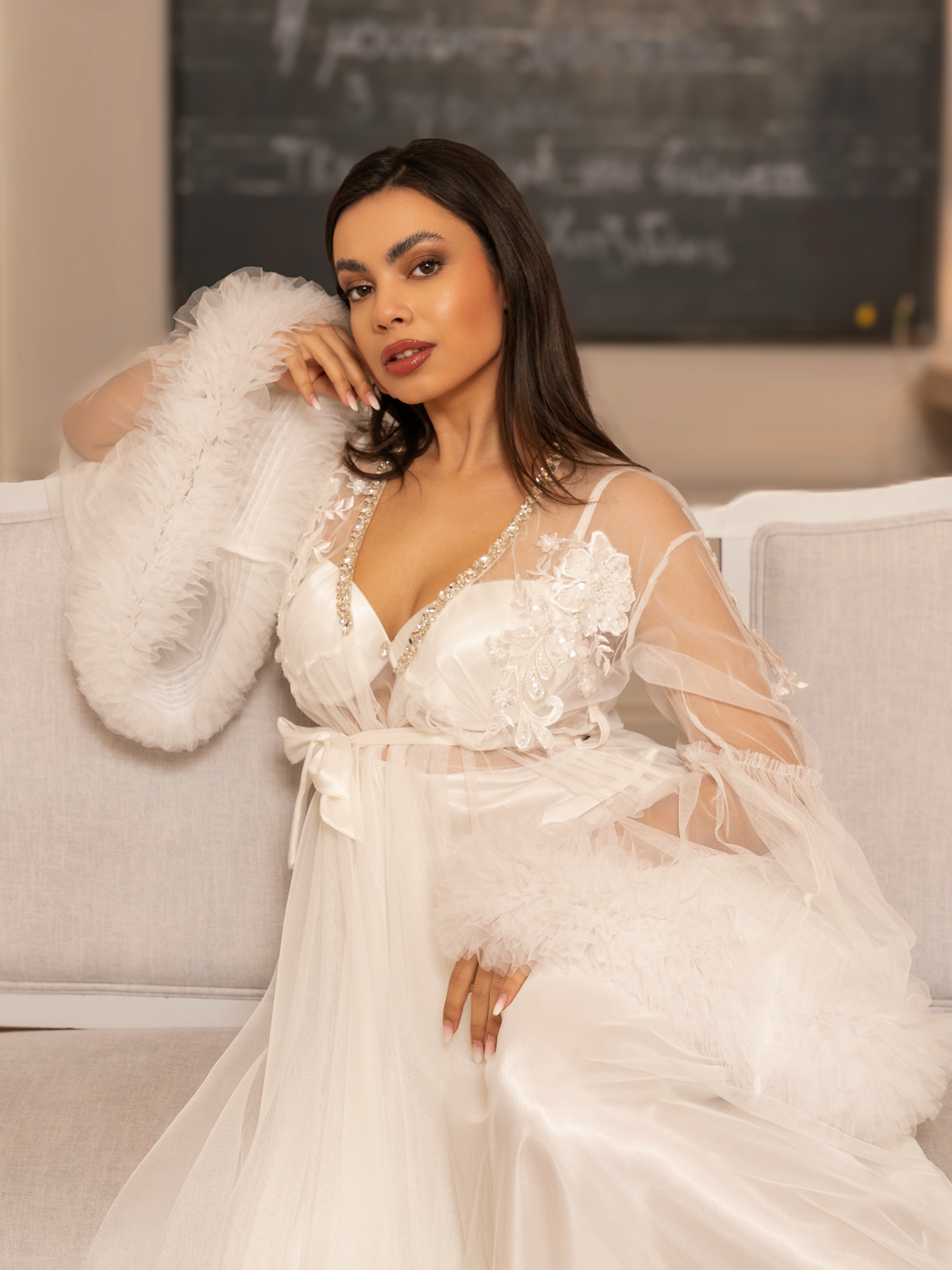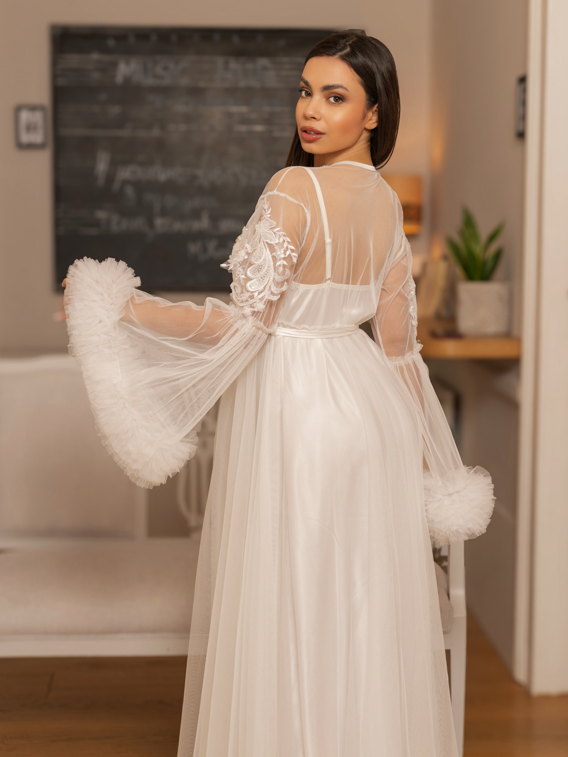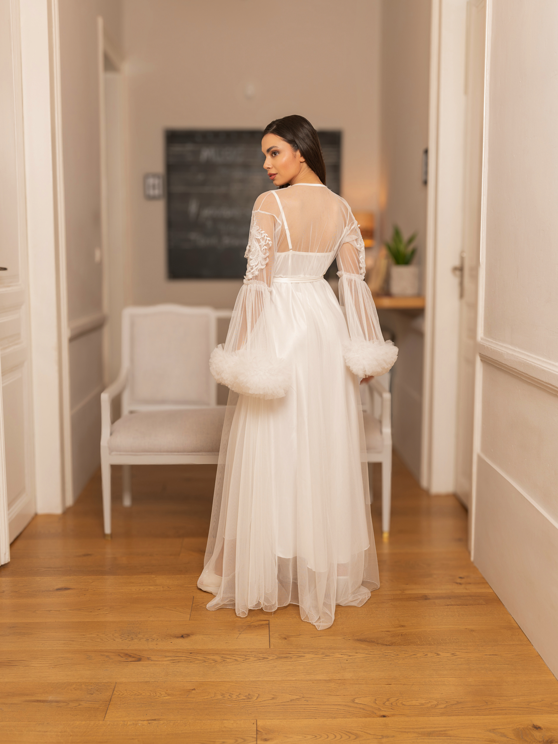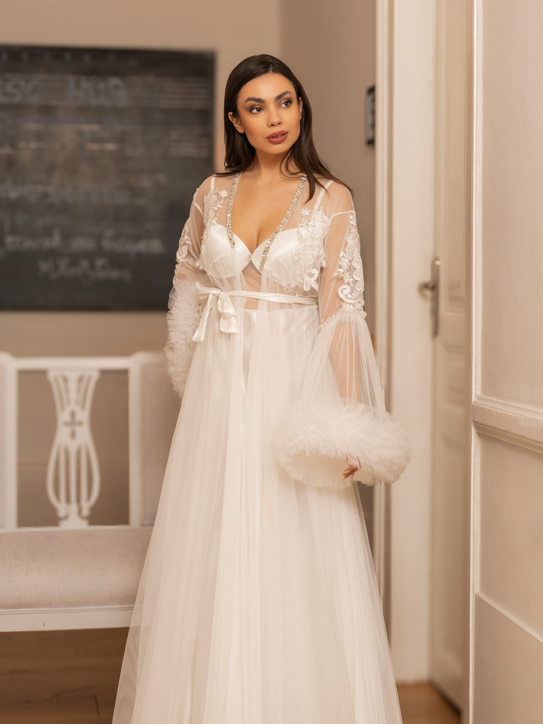 Σετ με εντυπωσιακή μακρυά ρόμπα από πλούσιο τούλι στο μανικι στολισμένη με λουλουδια στο μπούστο και strass στον λαιμό