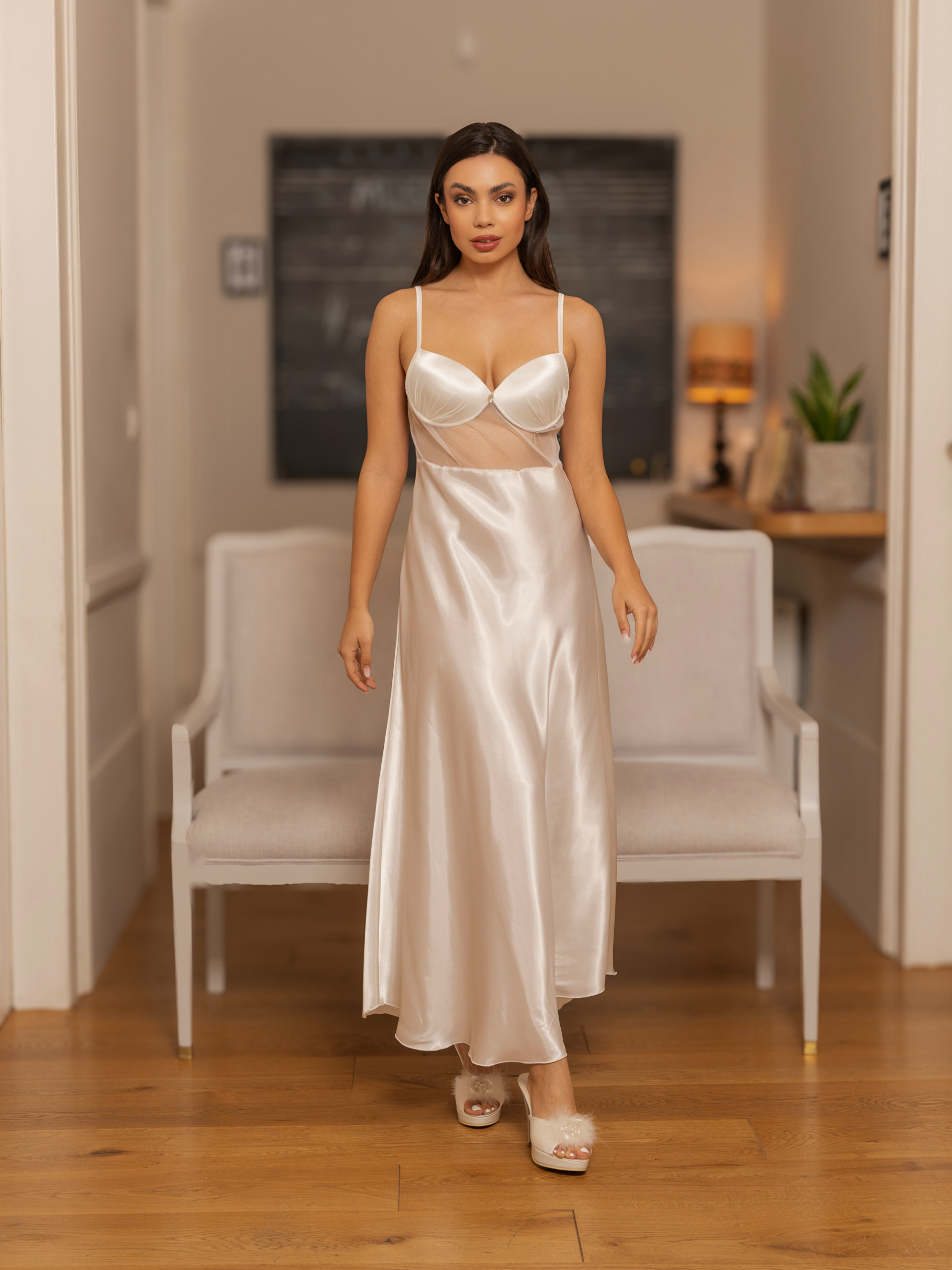 Νυχτικό μακρύ με push up cups μεγέθους Β στολισμένο από σατεν ύφασμα με διαφάνεια κάτω απο το στήθος